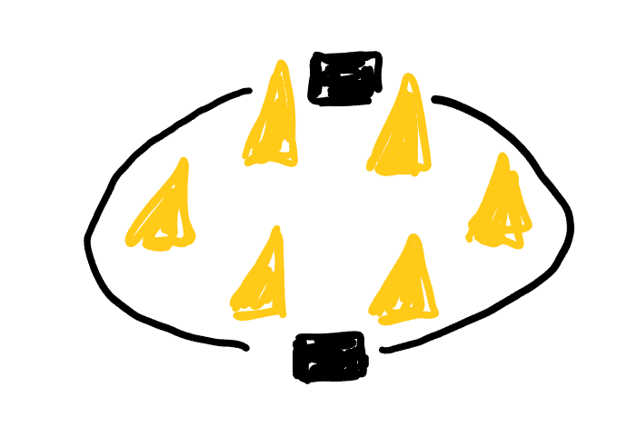 Now I gradually move two of the cones, one at a time. For example, if the mats are at 6 and 12 o’clock, I move the cones at 3 and 9 o’clock.