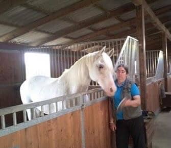 We benefit from this friendship as we start the training. Our riding arena is located at a distance from the horse paddocks, surrounded by forest, which can be scary. Particularly when our resident deer, Tino, roams the area.